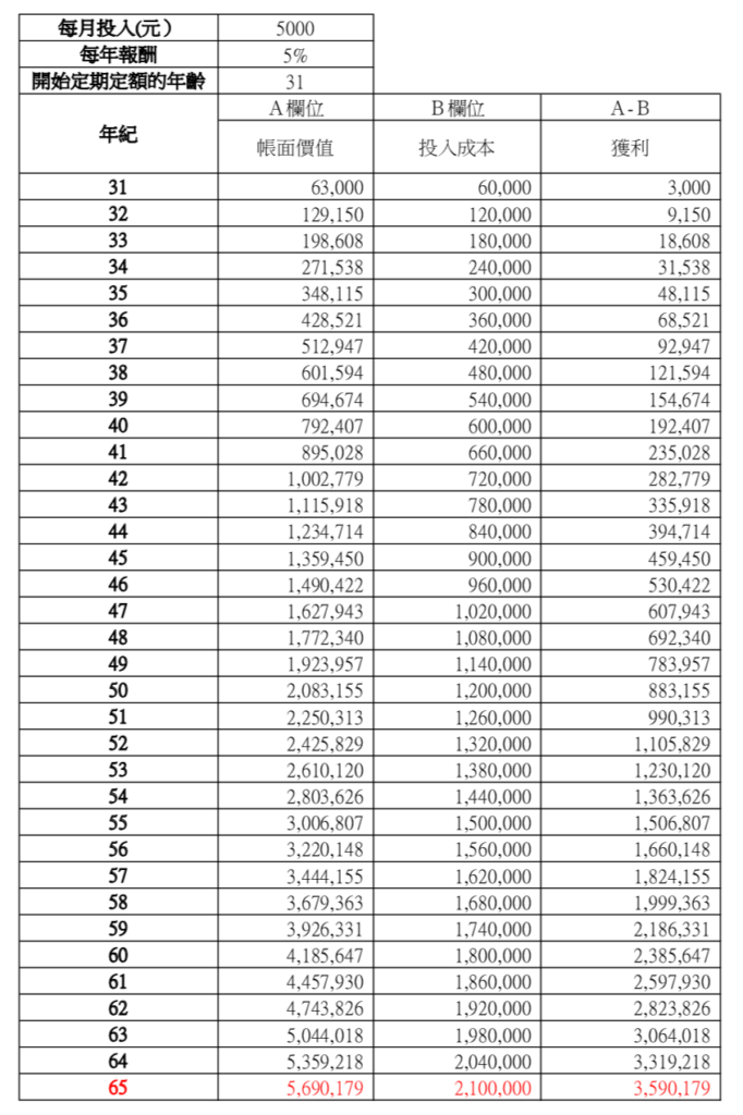 保守估計每年獲利5%,每月投入5,000元。