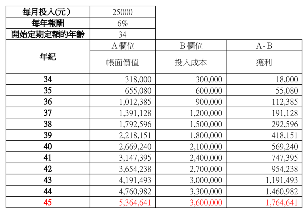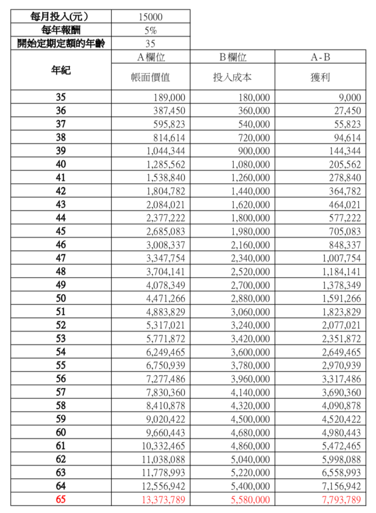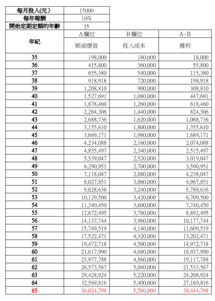 • 假設現在35歲就開始為退休準備一筆錢,就可以試算,自己每月投入X元,年報酬抓Y%,中間不獲利了結,到了65歲時帳面的狀況會是如何。